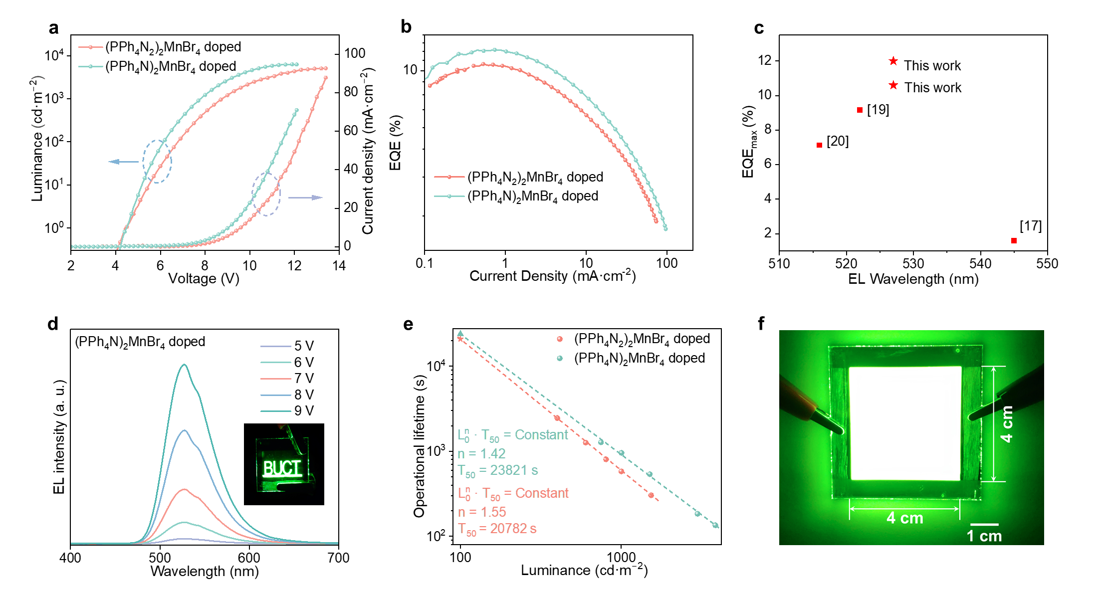 LEDs fabricated from undoped (PPh4N)2MnBr4 and (PPh4N2)2MnBr4 exhibited improved performance metrics, particularly in EQEmax (9.1% and 7.5%) and maximum luminescence (Lmax=2056 cd m-2and 1500 cd m-2). Furthermore, when doped with 9-(4-tert-butylphenyl)-3,6-bis(triphenylsilyl)-9H-carbazole (CzSi), the device performance of (PPh4N)2MnBr4 reached an EQEmax of 12.0% and Lmax of 6169 cd m-2, marking the highest efficiency value reported for solution-processed green lead-free metal halide electroluminescent devices. Moreover, large-area electroluminescent devices of (PPh4N)2MnBr4 were fabricated in air using the blade-coating method, highlighting its potential for display applications.