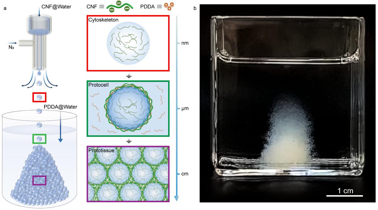 The bottom-up construction of prototissues from protocells is an important research direction for understanding the hierarchical assembly of living systems and developing artificial biomimetic systems. However, existing systems often suffer from complicated preparation procedures, reliance on oil-phase environments, limited prototissue size, and insufficient stability. Achieving efficient, controllable, and robust construction of prototissues in aqueous environments has remained a major challenge in this field.