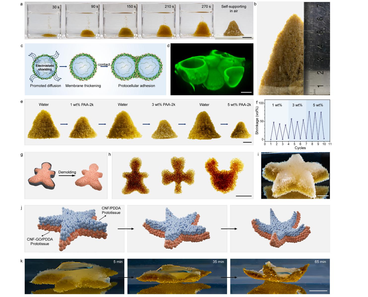 To address these challenges, the research team employed negatively charged cellulose nanofibrils (CNF) and the cationic polyelectrolyte poly(diallyldimethylammonium chloride) (PDDA) as building blocks. By integrating gas-liquid microfluidics with diffusion-inhibited complexation (DIC), they achieved the high-throughput fabrication of protocells. Further regulation of ionic strength induced adhesion between protocells, enabling the construction of large-scale prototissues in aqueous environments (Figure 1). The resulting prototissues exhibited excellent self-supporting capability in both water and air, while maintaining structural stability under external disturbances. By further tuning the functional components of the protocells, the researchers endowed the prototissues with a range of capabilities, including transmembrane mass transport, chemical communication, osmotically driven deformation, and buoyancy- or magnetic-field-mediated motion, demonstrating pronounced biomimetic behaviors (Figures 2 and 3). Compared with prototissues constructed from emulsion droplets or coacervate droplets, this system offers significant advantages in structural stability, scalable fabrication, and functional versatility, providing new opportunities for applications in tissue engineering, synthetic biology, bioinspired soft robotics, and biomedical devices.